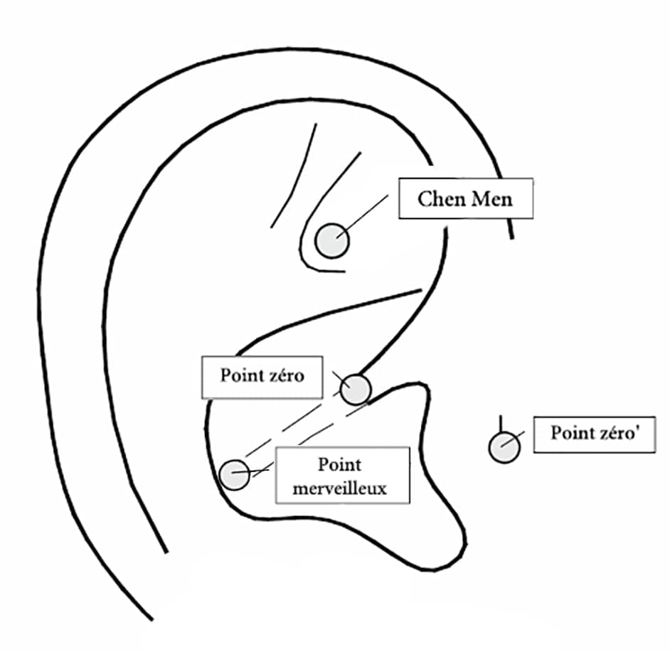 1/ Stimule le Point Zéro (maître du parasympathique): situé dans la dépression entre la racine de l’hélix et sa branche montante.
